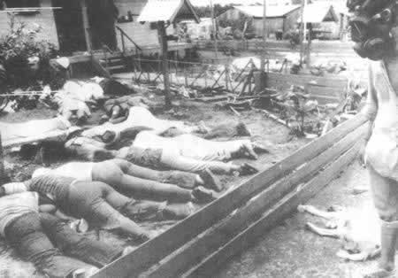 身穿绚丽衣着的迷信者们的尸体横七竖八地躺在圭亚那琼斯敦的“人民圣殿”的地上。死里逃生的只有80人左右,他们说,圣殿成员在自杀仪式上吞下了含有“苦尔-艾德”氰化物的调制品。幼儿被用勺喂下了这种致命物,而较大一点的孩子则被命令自己吃下。成人们自愿吞食,之后便相互拥抱着倒下。他们的领袖,詹姆斯-华伦-琼斯,别名吉姆-琼斯牧师,被发现死在接受圣餐的圣坛上,头部有枪伤。
